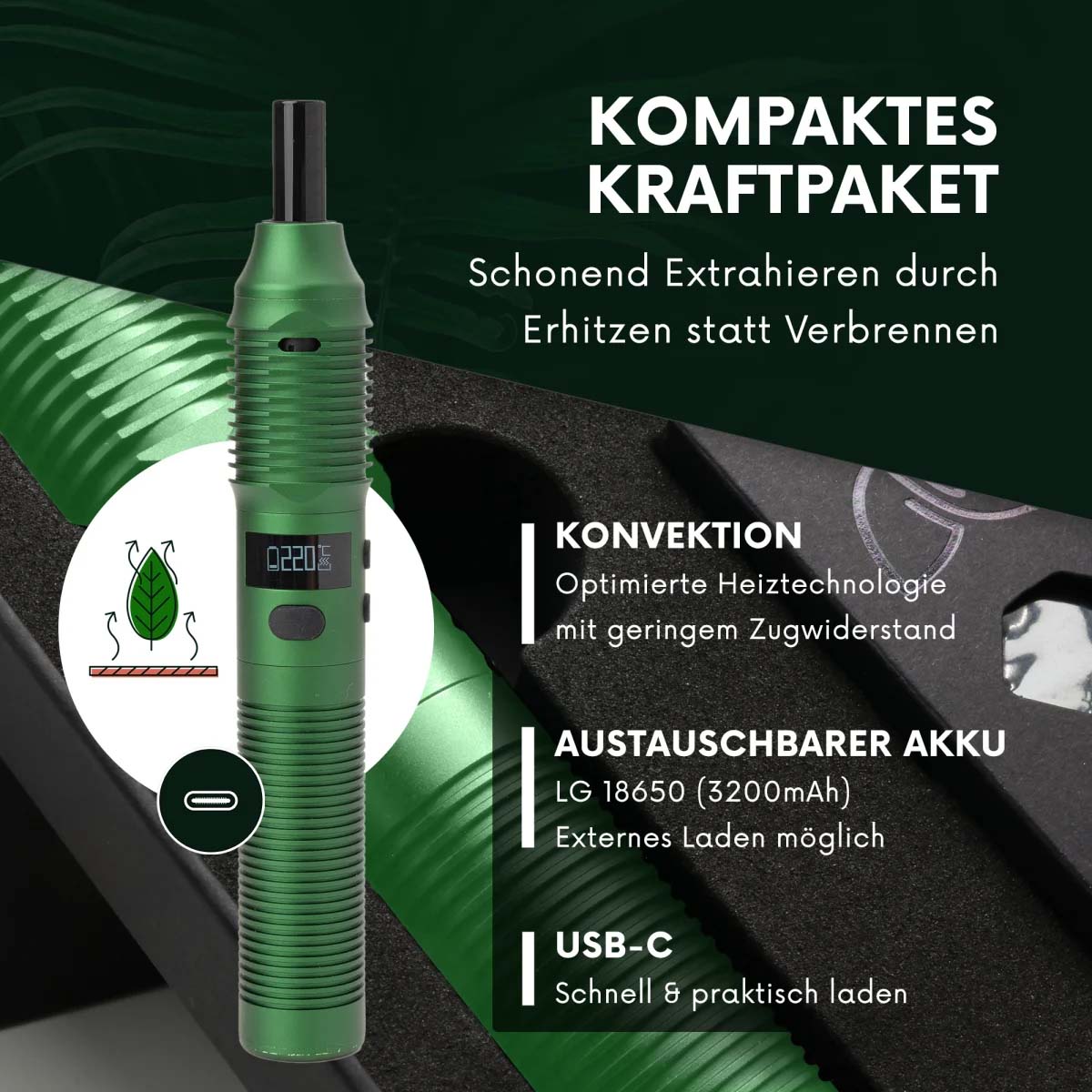 - Stufenlose + gradgenaue Temperatur – Hol das Maximum aus deinen Kräutern mit der für dich optimalen Temperatur zwischen 80°C und 220°C.